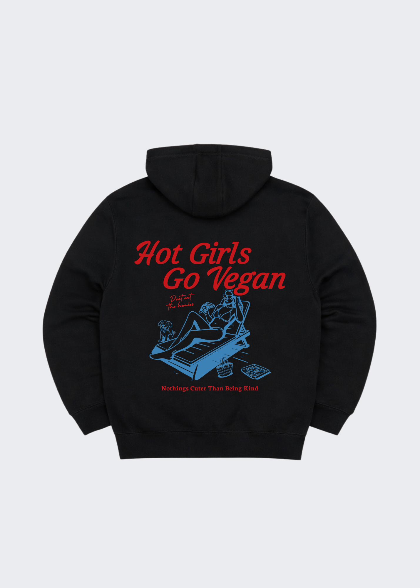 The iconic 'Hot Girls Go Vegan' design is now available on a soft, midweight fleece full zip with a 3 panel hood. This hoodie is perfect for everyday wear and made to last.