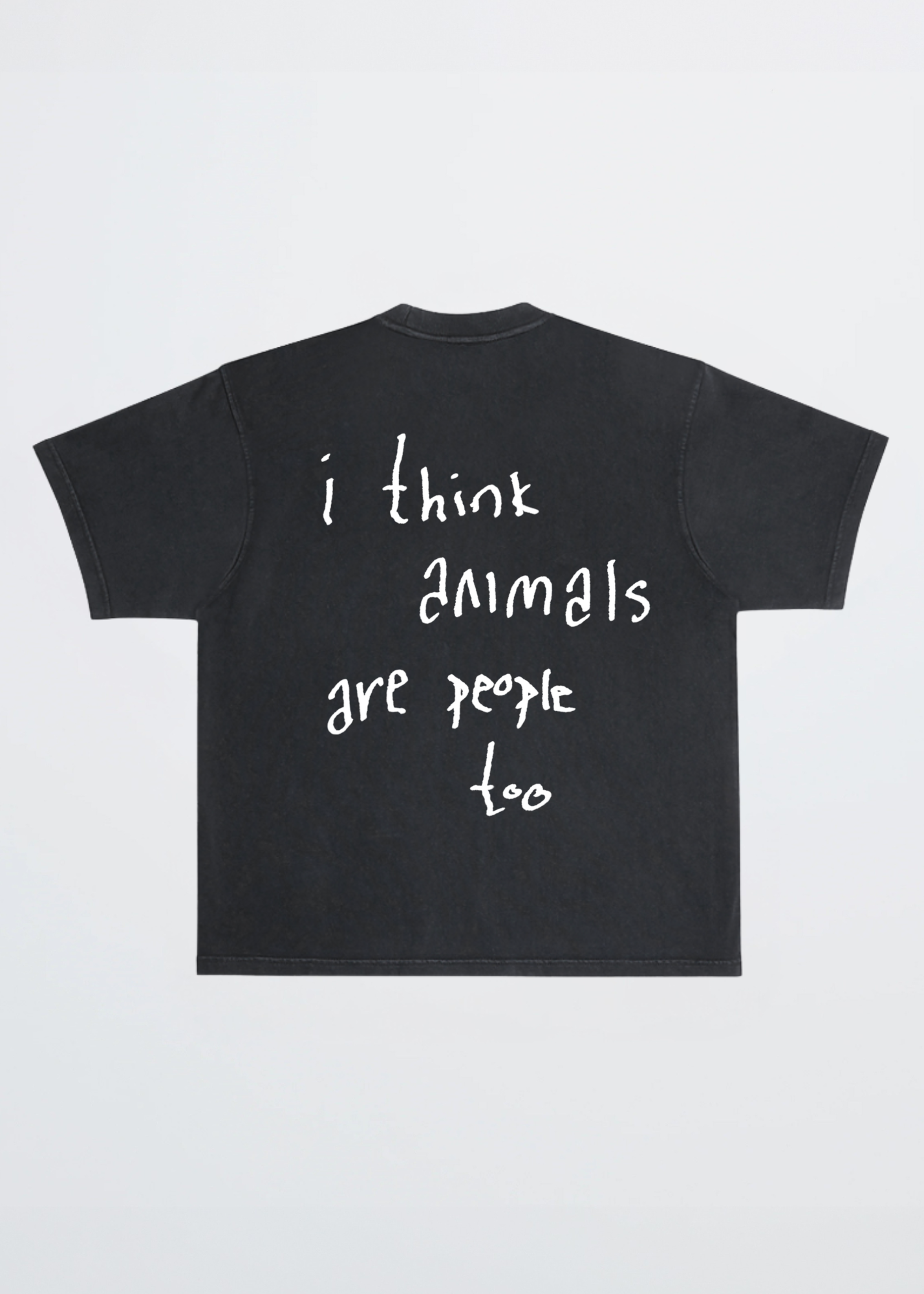 This unisex tee features our OG Dont Eat The Homies logo on the center chest and our scribbled 'I think animals are people too' graphic across the back.