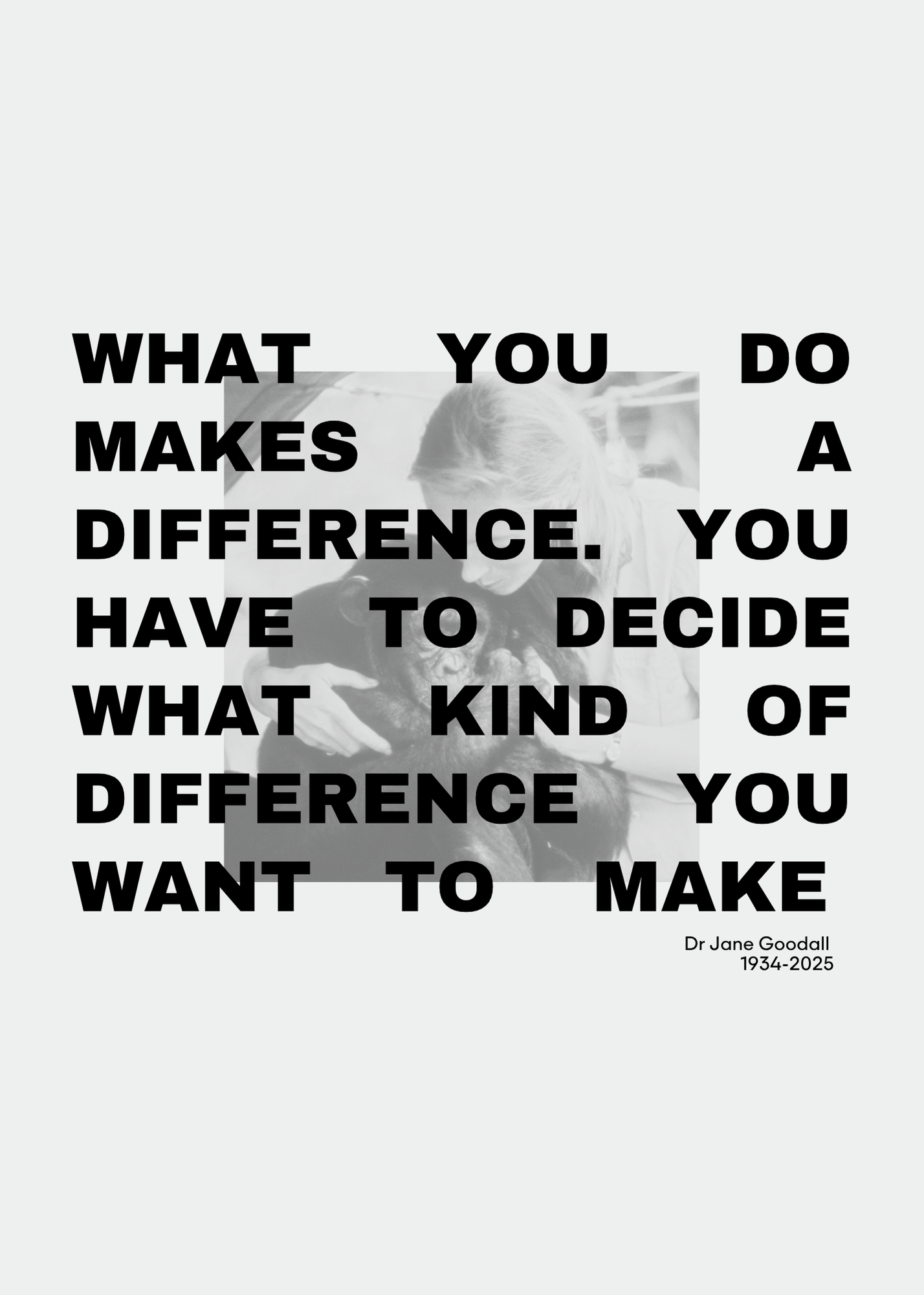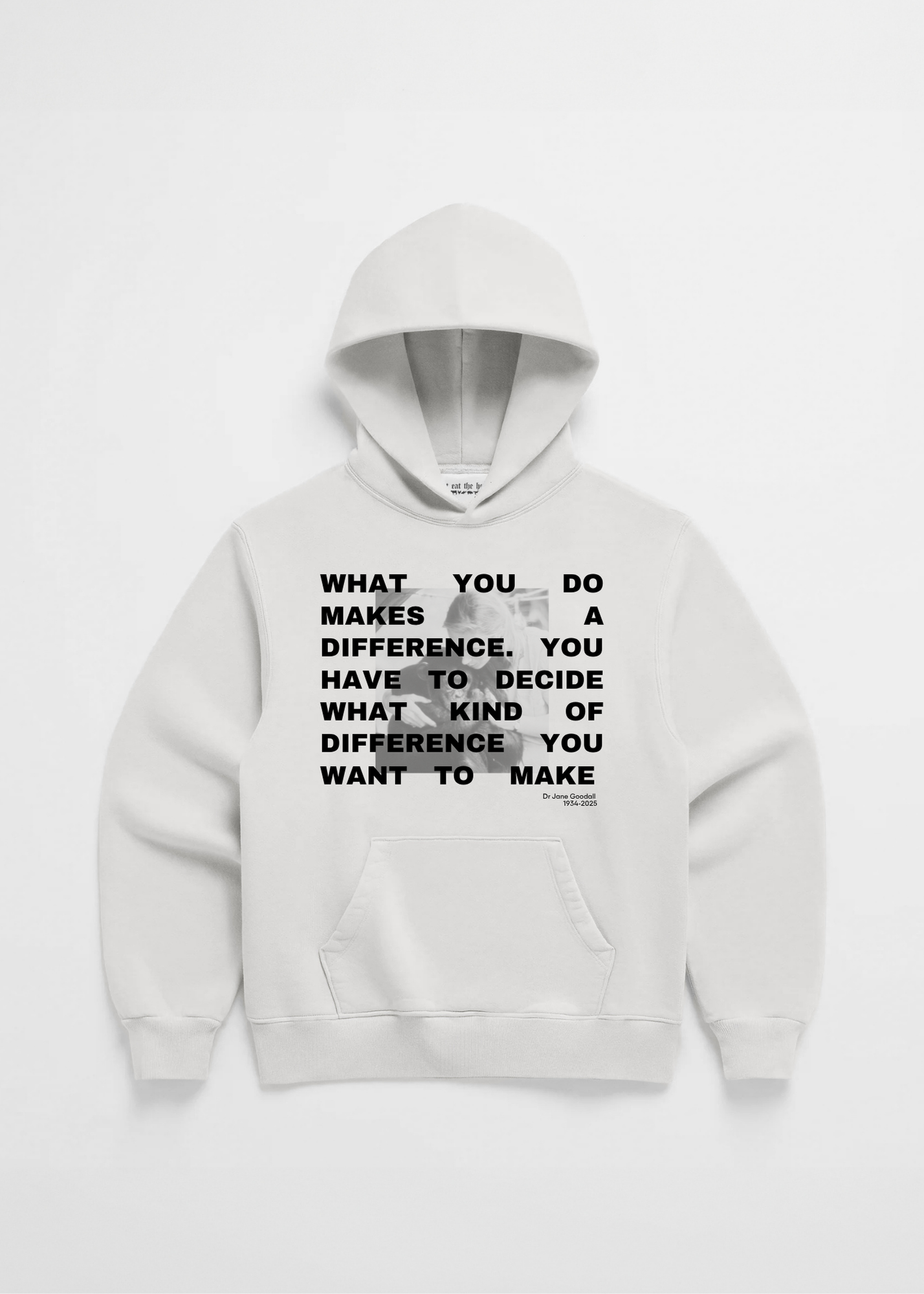 Designed with purpose, this hoodie features one of our favorite quotes from Dr. Jane Goodall’s across the chest: “What you do makes a difference, and you have to decide what kind of difference you want to make.”