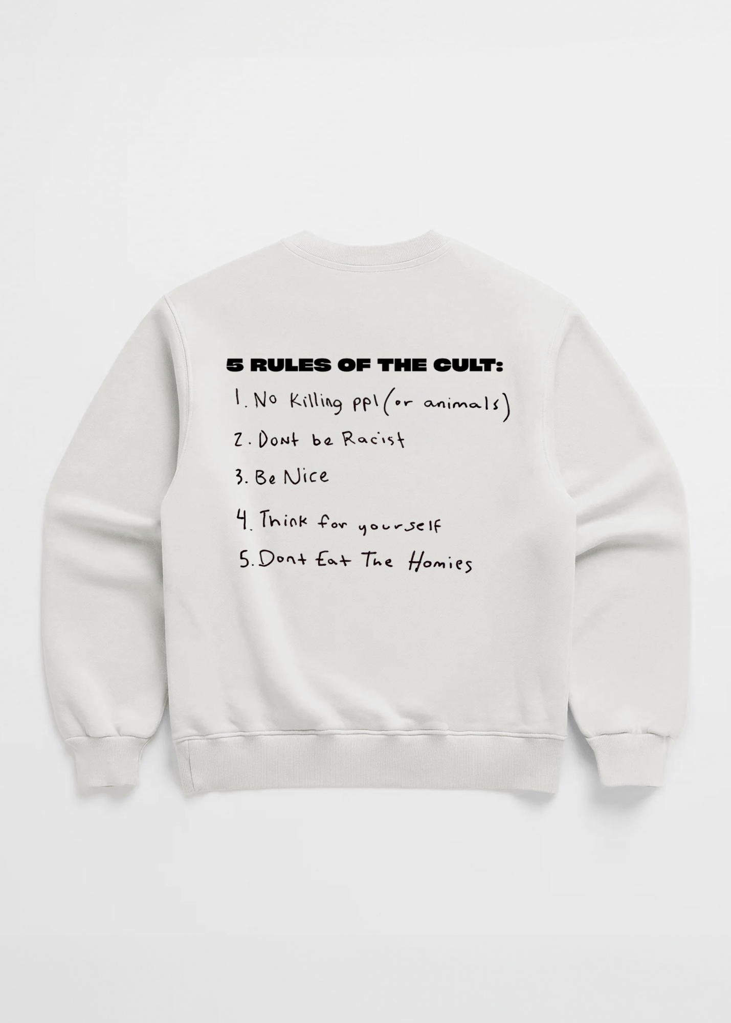 The 'Rules of the Cult' Crewneck is designed for people who somehow all agree on the same basic morals (rare, we know). Made from 80% Cotton and 20% Recycled Polyester, this crew featured an oversized fit and midweight feel, perfect for all year wear.