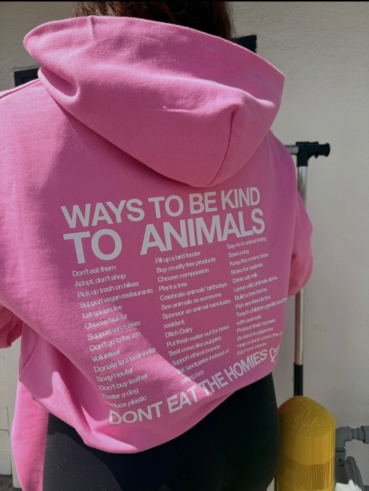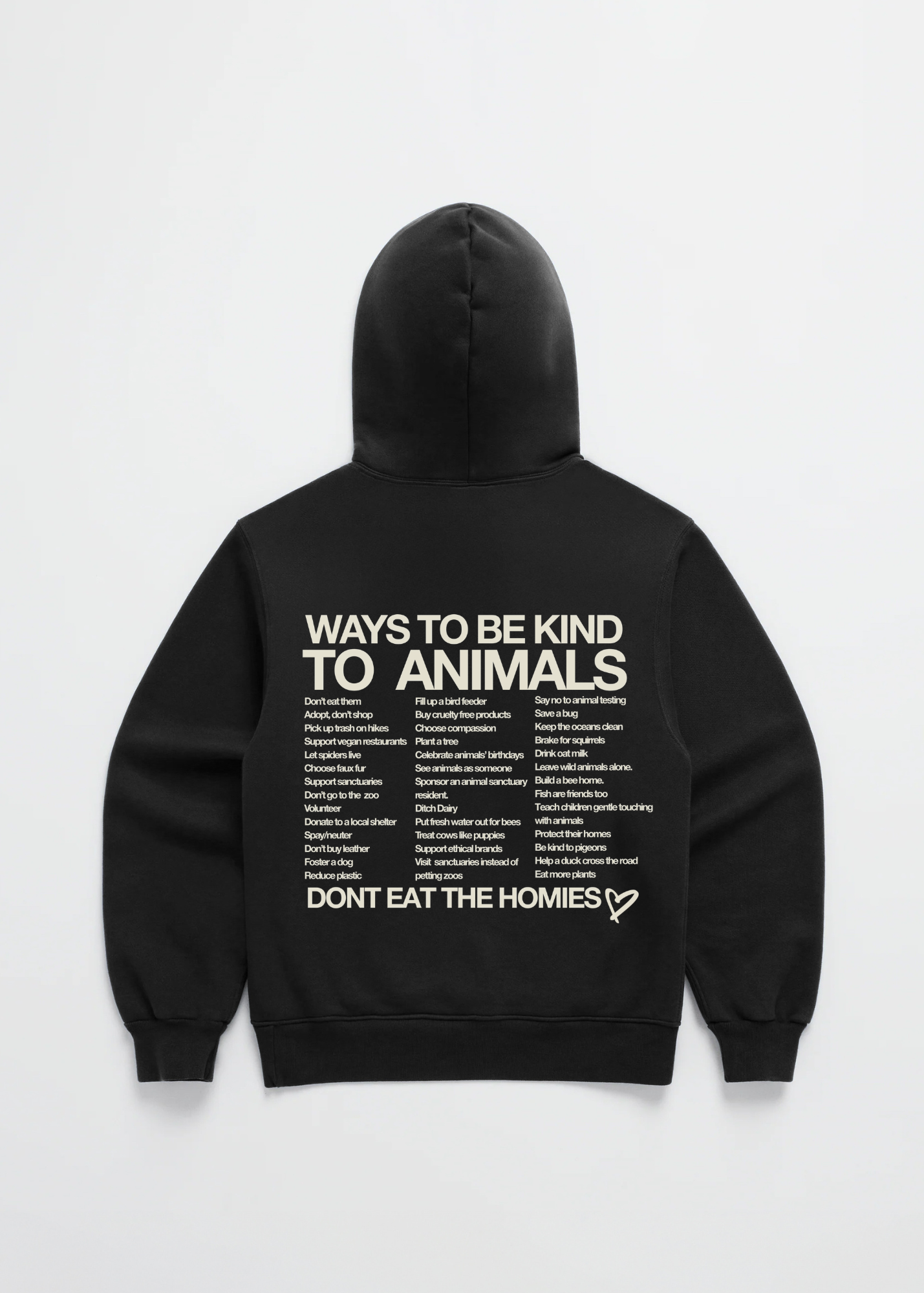 This midweight hoodie features our new Ways To Love Animals graphic on the back and a smaller accent heart on the chest. Made from 80% Cotton and 20% Recycled Polyester, this hoodie is perfect for everyday wear.